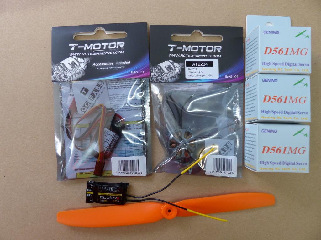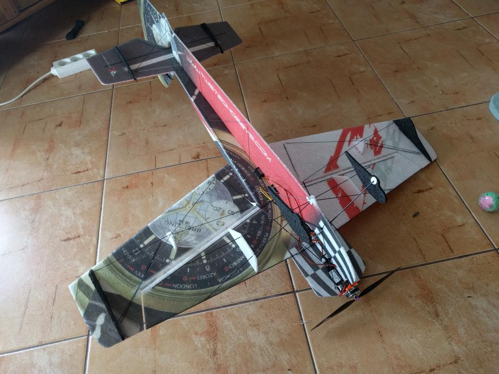 Já jsem použil ještě baterky Nanotech 2s 300mAh (asi 35C), přijímač JETI Duplex R4 a uhlíkovou vrtuli Mejzlik 9x3. Jen co dorazí PT 9x3,5 tak jí vyměním :-) PTčka mi sedí víc :-)