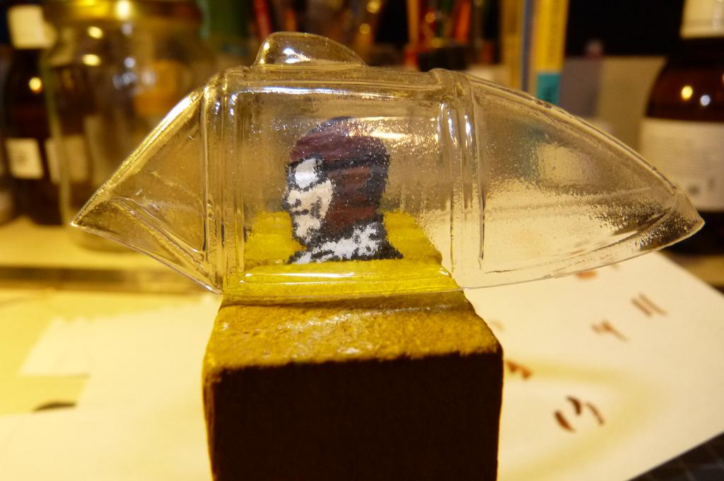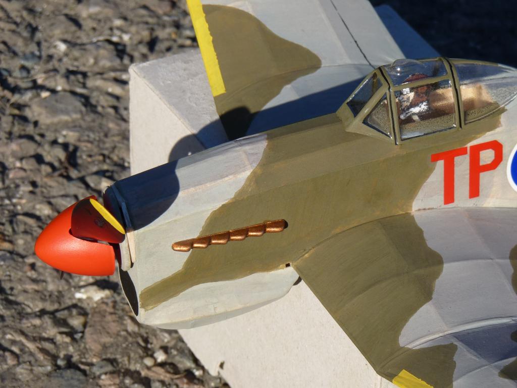 Zatím jsem se nerozhodl jak to nabarvím, nebo to nechám v barvě modelu jako takového a neměl jsem čas se do toho pustit. Přesto jsem měl potřebu nějak pokračovat, tak jsem alespoň z kancelářskýho papíru a vodovek udělal siluetu pilota do kokpitu. Je to takovej pilot-lupínek, masku si asi zapomněl na letišti, ale snad to trochu oživí.