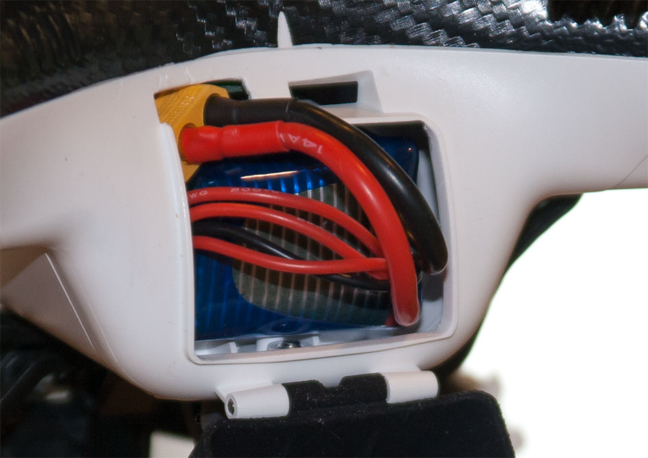 Přesto, že jsou dvířka nyní o dost větší (v černém provedení ani nevypadají nějak větší než ty původní), i tak jsem musel přistoupit k mírnému zvětšení otvoru bateriového doku v jeho levé horní části, kde se zasouvá propojený bateriový konektor. Nyní lze konektor již zastrčit dál, což již stačí dvířka v pohodě bezpečně uzavřít. Do zavřených dvířek se vejde i kabeláž baterie, která ani teď nejde zcela zasunout dovnitř jako u 2200 baterie, která je přeci jen nižší než nová Dinogy. Na nová dvířka plánuji dát zábleskový maják STROBON s vysoce svítivými LED (pro lepší LOS viditelnost), ještě uvidím, jak bude vypadat letový čas s novou baterií...