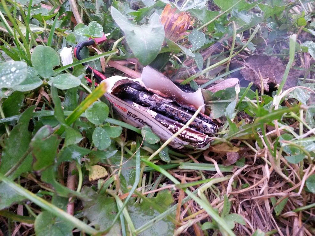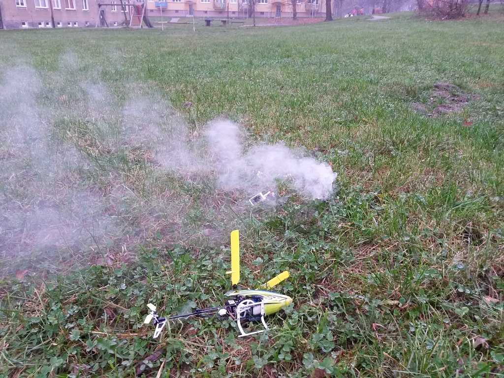 Připojil jsem první baterku, zvedl heli do vzduchu, začal lítat a asi po minutě zničeho nic zkrat na jedné z baterek v kapse, okamžitě se nafoukla, praskla a plyny začaly hořet asi 10s v mé kapse. Baterka kapsu okamžitě propálila a měl jsem ji hořící opřenou přímo o stehno :roll:. Myslím, že jsem stihl throttle hold, heli šla k zemi a já nevěděl, co dělat? ... jestli strhnout ze sebe kalhoty nebo baterky rychle z kapsy vyházet. Naštěstí v neštěstí se mi to povedlo, všechny jsem je chytil za kablíky a vyhodil z hluboké kapsy ven. Myslím, že chybělo málo a kalohoty začaly hořet ... fleecová mikina taky a běhal by tam po trávě "plamínek s vysílačkou na krku" :lol:.