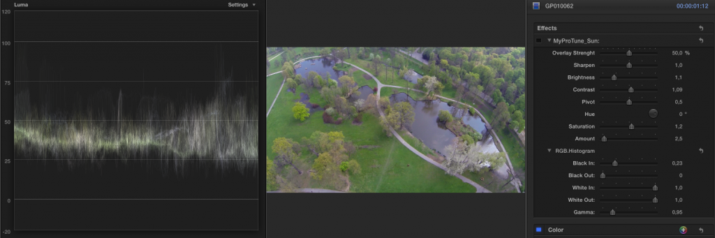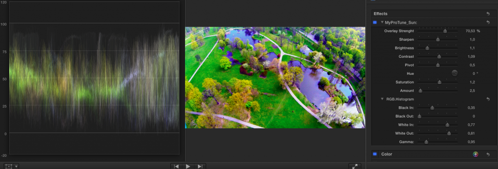 Pro rychlejší editaci ProTune jsem si vytvořil vlastní efekt. Tady původní zdroj v ProTune a zobrazení vektroskopu