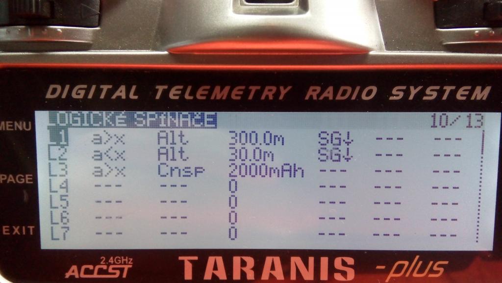 Sice to není lua ale dám sem vzorek na logické spínače v návaznost na speciální funkce. Používám to při FPV tak to snad někomu jako vzor pomůže. Používám čidla frsky vario (high) a FAS-100