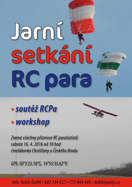 na zahájení letošní letové sezóny jsme připravili setkání RC parašutistů na letišti v Chrášťanech, která se uskuteční v sobotu 16. dubna od 10 hodin.