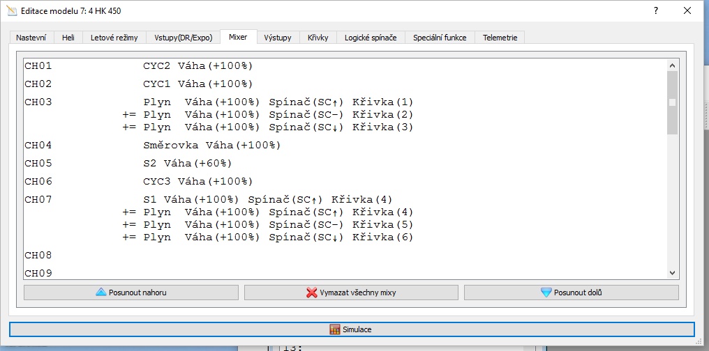Marek_Km píše:Absolutně nechápu nastavení pádlové heli. Co jsem si postahoval eepe tak mi to nefunguje tak, jako v PC v simulaci. Všechno jde, kromě cykliky. Chod serv v kolektivu se dá vyladit v servech pomocí subtrimů a křivek až k dokonalosti, ale prostě cyklika se nehýbe pomocí zdrojů CYC. Když jsem to obešel, tak jsem měl malé vychýlky, že jsem musel v vrťasem hodně rychle dolů, až to nevydržel podvozek a šlo to na bok. Listy skoro beze škod, ale je mi jasné, že budu muset měnit hlavní a příčnou.
