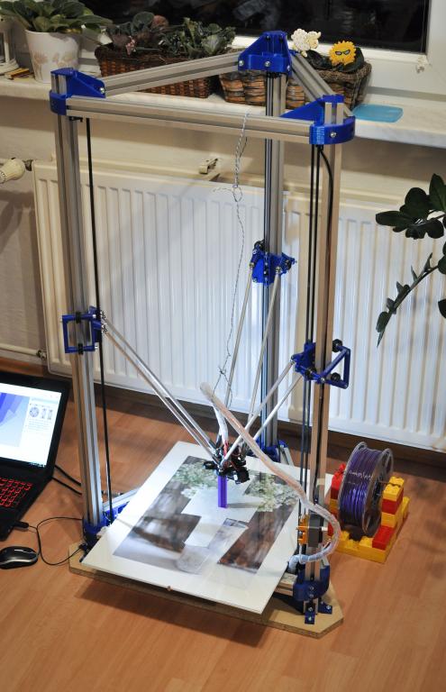 Jedná se o deltu, která vychází z Kosselu, ovšem všechyny díly jsou překresleny na klasický profil z Ehliník.cz 30x30 a doplnil o vyztužení, jelikož jsem skrblík a když už platím 6m tyč, tak jí využiju celou, proto má tiskárna rozměry 1100mm na výšku, šířka je půl metru.
