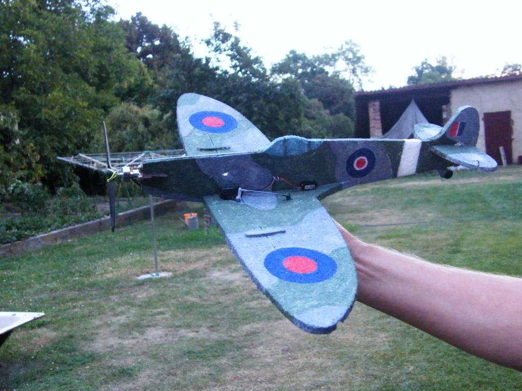 Létá to v házedlu Spitfire rozpětí asi 50 cm, váha s přijímačem, baterkou, reglem , 3 servy celkem 90 g. Hezký den