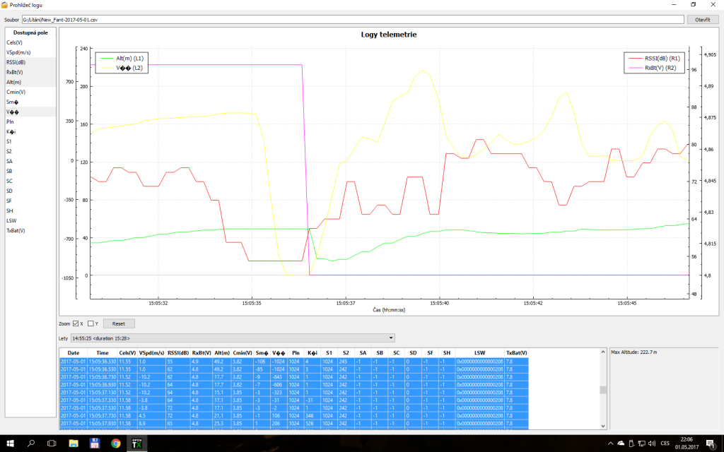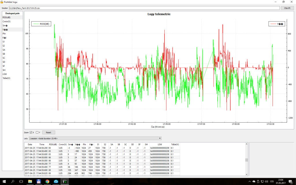 Zdar, potřeboval bych poradit: dnes jsem byl lítat, vše v pohodě až do úseku 15:05:35, kdy se mi letadlo předvedlo jak umí rychle čumákem k zemi. Určitě jsem nepotláčel výškovku jak je to ve snímku logu vidět. Vybral jsem to na poslední chvíli, v ten moment mi to přišlo jako výpadek signálu, ale na logu je vidět RSSI v ten moment kolem 56dB... Na chviličku mi rádio zahlásilo výpadek telemetrie.