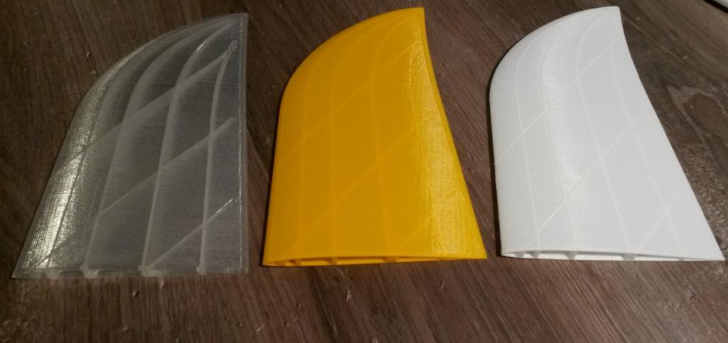 Ten 3D honeycomb v řidším provedení, kdy byla stejná hmotnost jako u vlastních výztuh, byl málo pevnej, prohýbal se a celkem snadno se zlomil. Se stehným nastavením a vlastníma výztuhama je to nesrovnatelně pevnější.