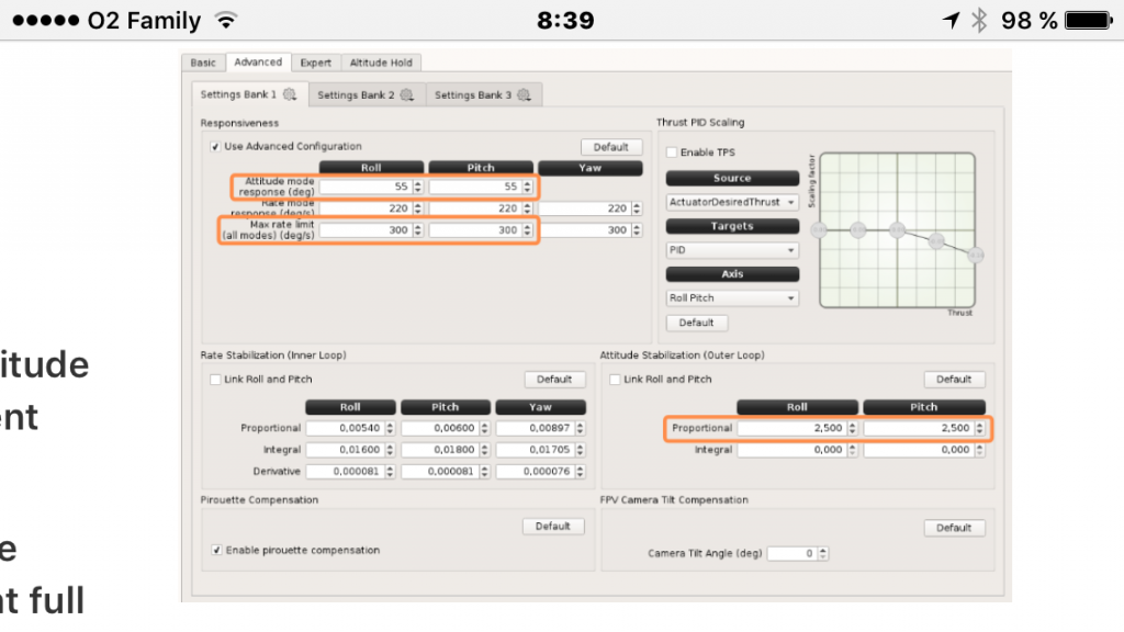 Ja skoušě lítat na symě x5 a v pohodě má jí tata a vítr mi nevadi ani malí prostor jasně nezaletím s tím bůh ví co ale minimum havarii akorát má jí v modu 2 ja sem z letadel zvyklí na mod 1 tak je to pro mě nepřirozený ale nastavení v librepilot už sem delal 10x vrtule jsem taky kontroloval a když sem to zvedl do 1,5 m tak se to převratilo bez zásahu do řízení nejde mi to v klidu postavit do visu. Teď jsem do desky dal fimware a boatloader betaflight a zkusim to ještě nastavit v něm zdá se mi jako by bylo moc citliví giro a vibrace rámu mu zkreslí co má delat. Nebo uz fakt nevim "atitude" jsem sundal na 30 "Atitude Stabilizaccion outer lop" mam na proporcional na 25 dal už nevim.