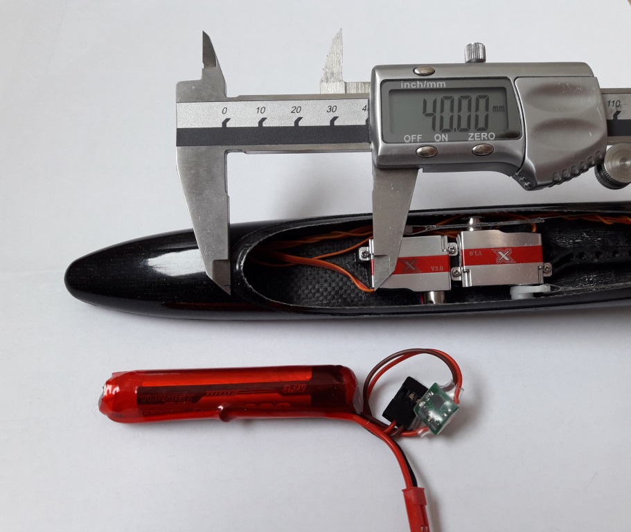 V1 a V2 je navržena pro vzdálenost 40mm od rámečku kabiny, 1S Turnigy 900 mAh. Tato elektroinstalace a rozmístění poskytují dostatek místa pro přijímač, který je obvykle vedle baterie.