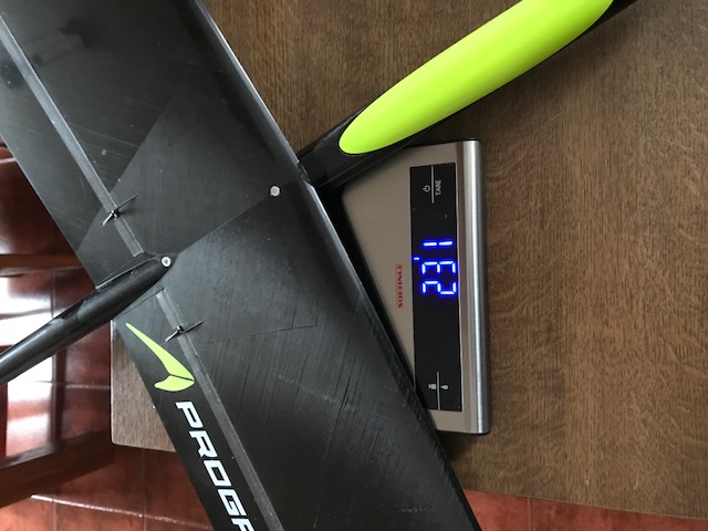 Model jsem napípal dle doporučení výrobce, těžiště nastavil na hodnotu 66mm. Hned první hody ukázaly, že letové vlastnosti modelu jsou vynikající. První den jsem skončil s těžištěm na 70mm, druhý den jsem přidával malý brok. Ve výsledku je těžiště 69-70mm. S touto hodnotou je letová hmotnost 237g Zatím mám nalítané tak 3 hodiny. Podařilo se mi zhruba odladit diferenciace křidélek a trimy letových režimů.