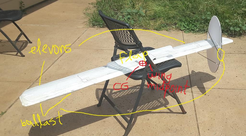 I've been calling this plane the SlashDot. Wing is EPP, 72" by 9.25" constant chord, MH45 airfoil at 11 percent thickness. Three control surfaces each span 1/3 of the trailing edge (the central flap is optional). The vertical stab is at a fixed angle of 30 degrees, is displaced aft-right so that I could slide it forward a few inches and put a bit of ballast on the front of the circle, and is circular because I thought it looked weirder that way.