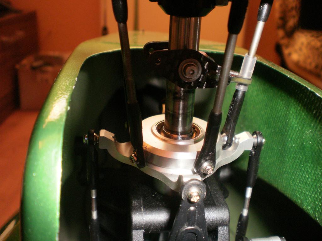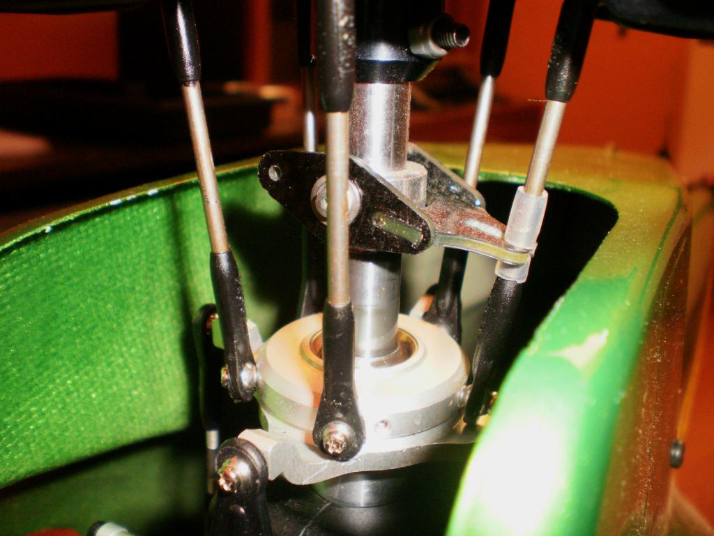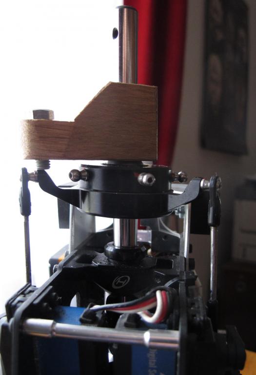 Zbývá kontrola roviny desky cykliky s přípravkem na hřídeli, osadit hlavu, komplet osazená táhla s kloubky ( kde jsem řezal 2x levý a 4x pravý závit ) pak rovina listů a rozsah úhlů. A v předstihu zalepit vrtulku, to nikdy nedělám na poslední chvíli. Pevnostní šroubky mají bohužel příliš krátký závit, tak tak se chytá těsnění v samojistící matici a musí se to radši zalepit. Zkoušel jsem tam delší šrouby, ty už se ale nedělají s hladkým dříkem. Závit po celé délce i skrz mosazné futro zalepené v listu není zrovna dobrá věc.