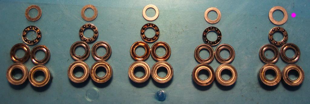 Druhý problémek byl s podložkou mezi radiální a axiální ložisko. Jednak jsou radiály a axiál v závěsu v jiném pořadí než u TREXe ( axiální je u něj na konci u listu, u Raptora je axiál uprostřed ), ale hlavně mi buď zmizela jedna podložka (10/6/0,42 ) nebo chyběla už švícovi a dal tam větší rozměr ( 11,5/7/0,48 ). Ta větší vypadla ze sortimentky kde bylo vše rozebrané. Protože měla větší i vnitřní průměr, neseděla by rovně a mohla se dotýkat vnějšího pláště radiálu což není dobré. Nezbylo než ztenčit podložku stejných rozměrů ale síle 1,1mm na čelní brusce přes šroub s matkou v zapření až na cca 0,6mm, zbytek už vzít jemným plochým pilníkem v ruce a nekonečným měřením digišuplerou aby to mělo rovnoměrnou tloušťku. K bezmezné radosti jsem se vrátil z dílny a zjistil že chybí další podložka,,,,,, Krátké hledání k ničemu tak jsem šel vyrobit ještě jednu, pak jsem tu ztracenku klasicky našel tak mám rezervní :-).
