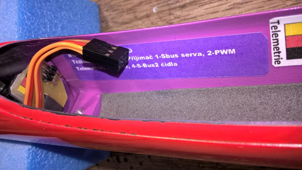 Ani nepočítám kolikrát jsem to proměřoval, ale nejdřív se zastrčí dozadu do trupu destička s přijímačem, variem, 10A sondou a Zepsus přepínačem. Pak teprve Rx baterka a zajistí se. Až poté deska se servy V tailu. Tady je ohromná výhoda S-Bus serv (a vůbec S-Bus Futaba ). Deska serv ponese ještě plošňáček kde se budou sbíhat do jediného kabelu signály od všech serv..., též telemetrie vepředu z kabiny a signál pro motor.