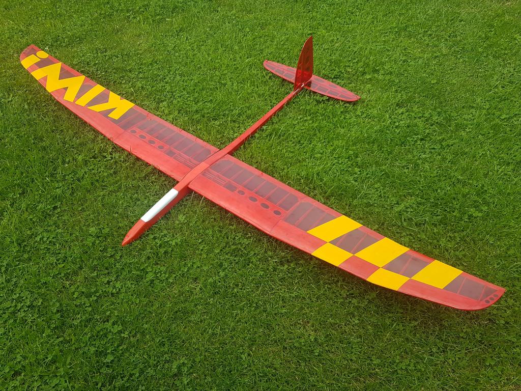 Dorazila smutná fotka Kiwika zapíchnutého do země. Po rozboru proč k tomu došlo, jsme zjistili jednu nepříjemnou věc. Sice jsme na to upozorňovali jak já, tak Tomáš Hrubý, který správné provedení tohoto důležitého detailu dokonce několikrát fotil do své stavební fotogalerie (odkaz v prvním neustále aktualizovaném příspěvku). Na výkrese je to navíc také tučně napsané! No prostě a jednoduše nebyly epoxidem vylité kapsy v místě pouzdra spojky. Křídlo tedy v tom nejvíce namáhaném místě nemělo vůbec žádnou stojinu!! Přesto všechno vydrželo mnoho startů na gumě. Pilot si dokonce chválil, že ve větru to jde střílet jako F3Jéčko. Jednoho startu si křídlo řeklo dost a takto to dopadlo.