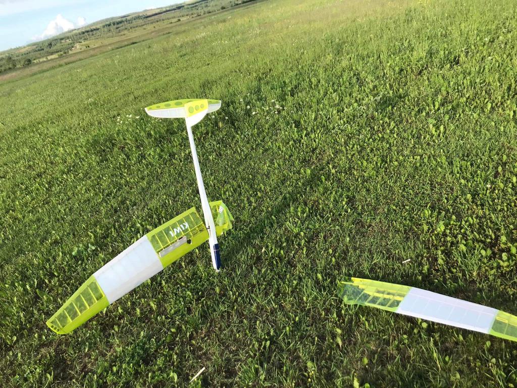 Kiwik ze 100m kolmo v zemi. Poškozený je však pouze jeden ze středů. Po dostavbě nového středu z ND je model opět letuschopný, trup a ocas OK.