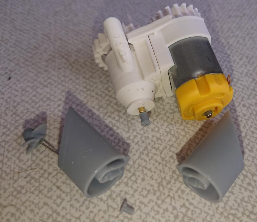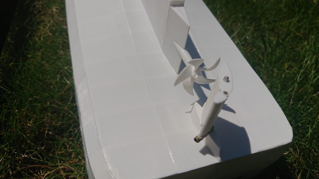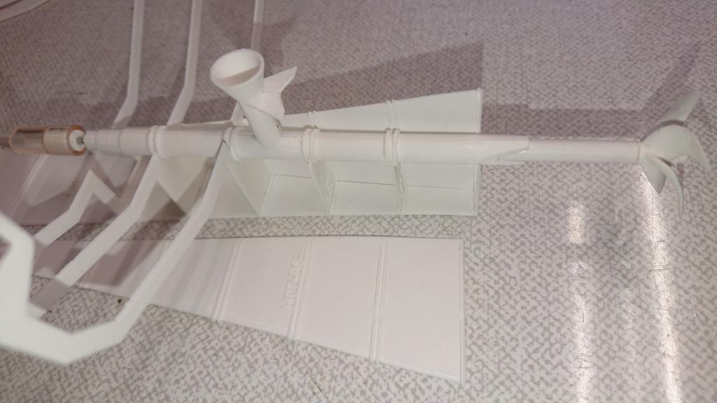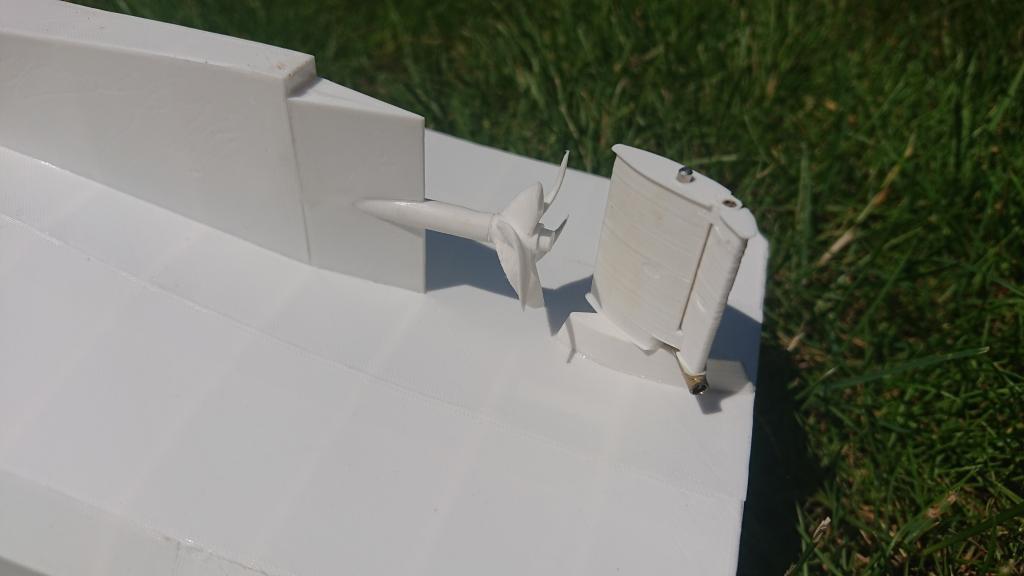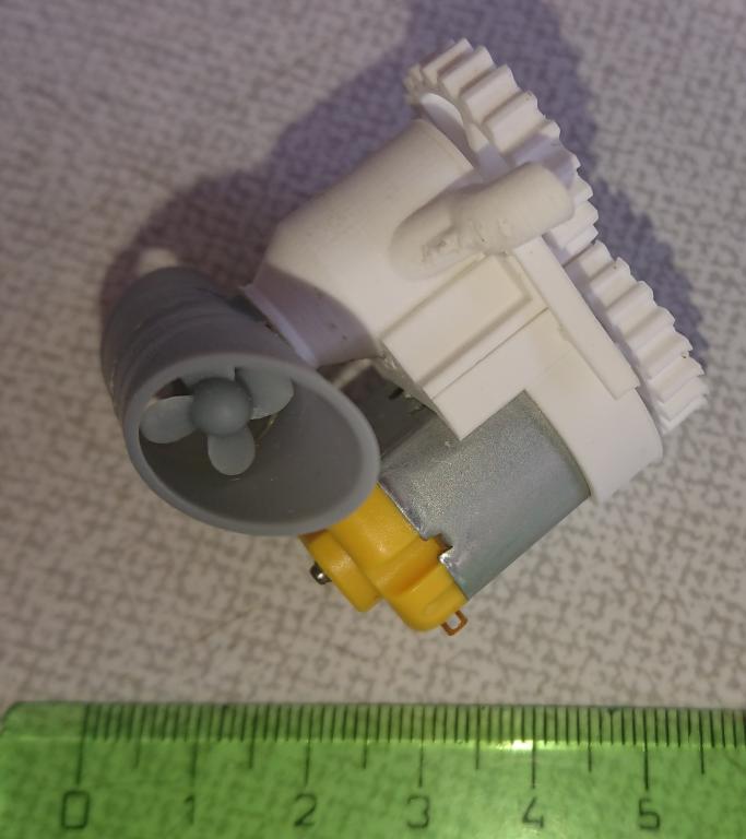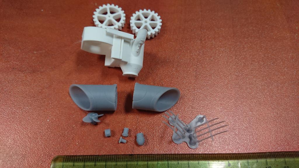 A jedna opravdu malinkatá lahůdka, podařilo se mi vyrobit i funkční bow thruster s průměrem jen 12mm. Bílý materiál je ABS, tištěné tryskou 0.25mm, šedý je tištěný resin s vysokým rozlišením. Uvidím, co to vydrží, po otestování ve vodě se zatím zdá, že OK. Ozubená kolečka budu tisknout z mechanicky odolného resinu, tohle je jen na zkoušku do mého modelu, z obyčejného. Ve finální verzi přibude i možnost sestavit to s boční lopatkou, sestavování s těmi ozubenými kolečky chce opravu velkou přesnost (je to titěrné, tak pro hodináře