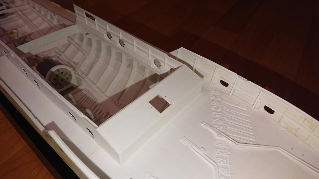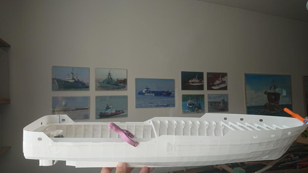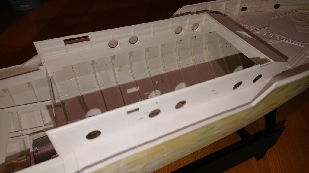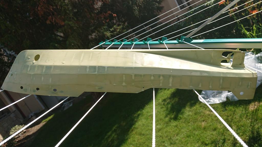 Na tomhle pracuji téměř denně. Přes léto jsem dokreslil detaily na palubě, abych do ní mohl dokreslit výřezy pro ně. Což zabralo trochu víc času. Ale teď už je vlepená i přední paluba. Trup je hrubě obroušen po přestříkání tmelem (Motip filler) a někde místy i polyesterovým tmelem. V nestřeženém okamžiku jsem trup dal sušit i na sušák určený k něčemu jinému