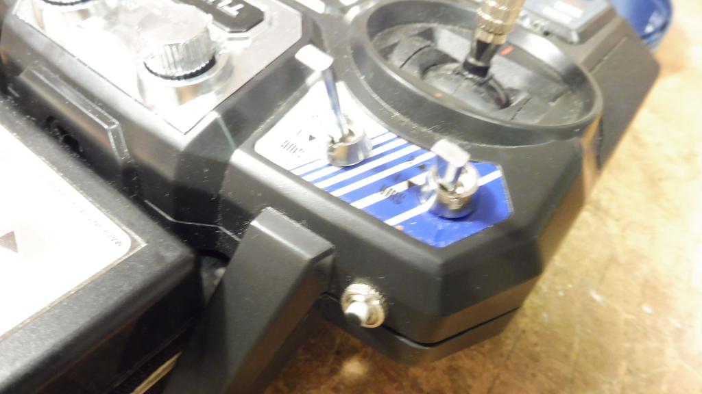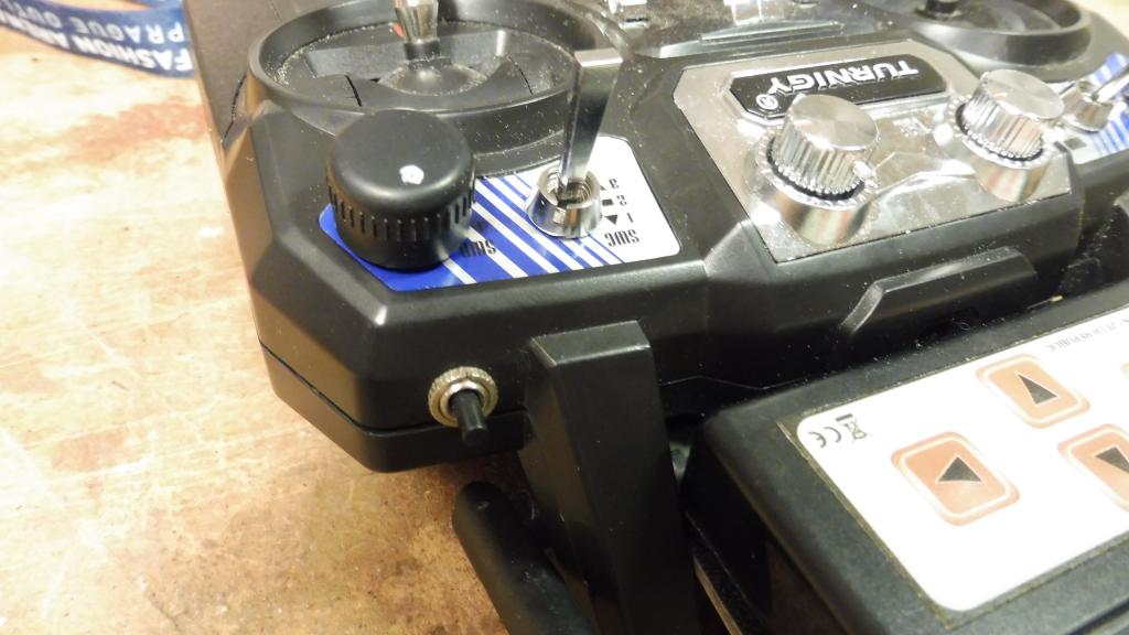 na čelní levé straně mám druhý mikrospínač--stiskem se mi rozeběhne motor něco přez polovinu, používám to pro start modelu z ruky abych nemusel přidávat plyn pusou, pokud používám duplex, jde na přijímači pro motor nastavit pomalý rozběh, používám to u větronu, kde nepotřebuji aby se vrtule roztočila rychle a od té doby co to takto používám už nelámu vrtule o zem, když si omylem cvrnknu do plynové páky, u flysky to mohu bouhužel nastavit pouze když takové nastavení umožnuje regulátor.