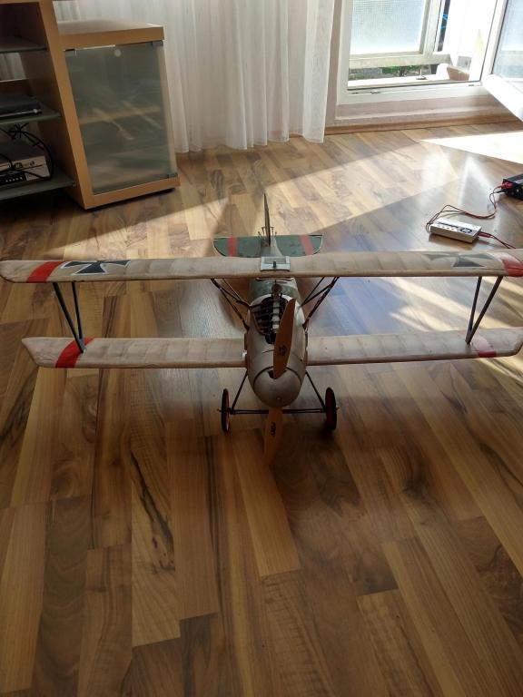 Po delší odmlce fotky skoro hotového modelu. Zbývá pár detailů - nějaké nápisy na trupu, natahat výplety, udělat "plechové" přechody křídlo-trup, posadit do kabiny pilota... Na rozdíl od dříve stavěných WW I modelů to vypadá, že budu mít opačný problém než obvykle - model má i bez baterie těžiště skoro přesně podle výkresu 8O