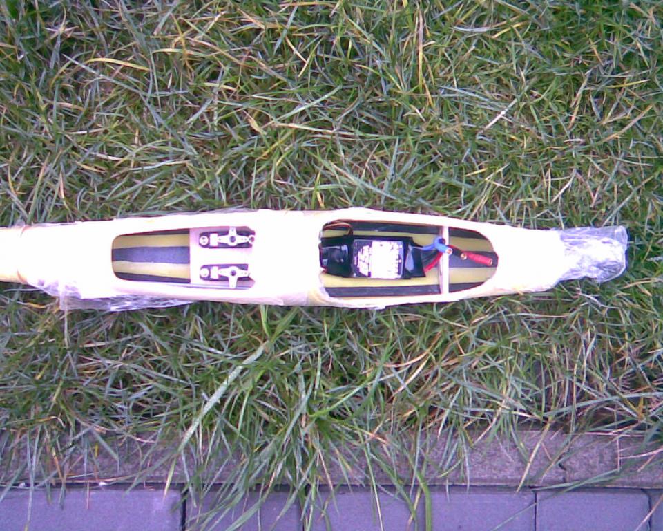 dorobil som náhon na výškovku a smerovku, ešte dokúpiť predĺženie k servám na ovládanie krídielok, zatial váha bez baterie a predlžovacích káblov t.j. motor, vrtula, prijimač, serva,regulator je 1210g sňad sa z letovkou zmestím do 1500g.