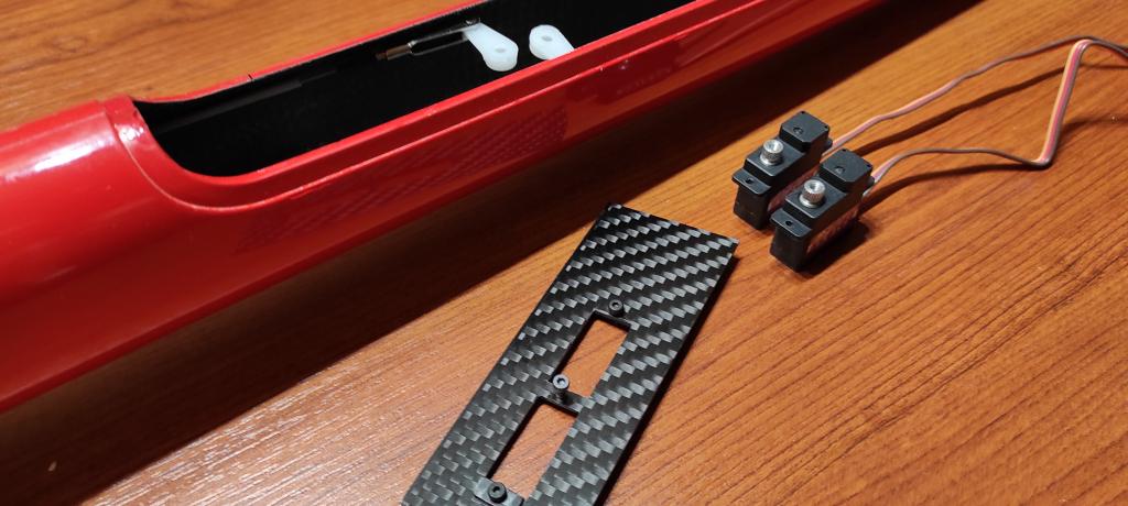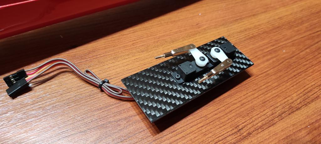 Stejným postupem se realizují serva do křidélek. Rámeček z uhlíku - 4 mm a základna 0,3 mm, epoxidované závity..hmotnost se šrouby M2 1,8g