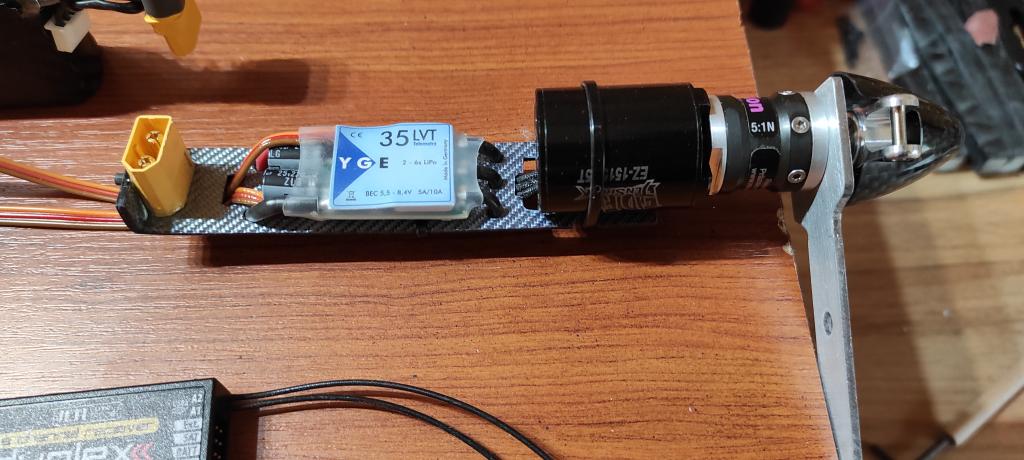 Plato elektroniky k motoru je ze sklo-uhlíkové desky 1mm ..hmotnost zanedbatelná. Nese regulátor a konektor pro připojení akku..