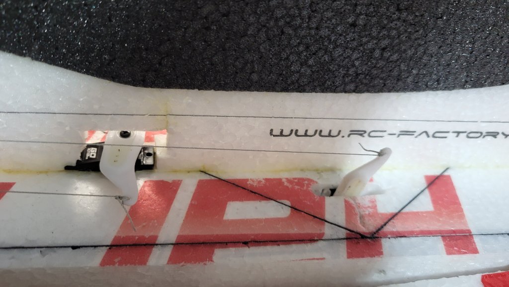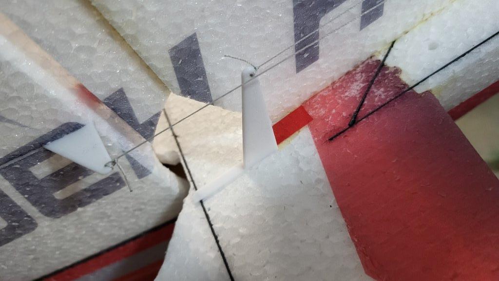 Po zkušenostech s uhlíkovými táhly, která hrozně jedou s teplotou, tedy asi se spíš roztáhne EPP, tak jsem udělal lanková táhla. Na servu je uzel posunut o 5 mm k předku. To umožňuje prověšení lanka při plné výchylce. Ve středu je to pevné, mimo nepatrně povolené. Za letu to nevadí a pro přepravu a úschovu je to lepší.