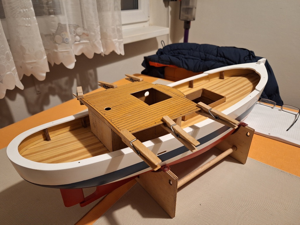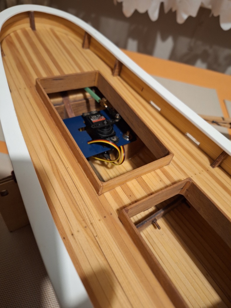 Plaňkovaná paluba, celo-plaňkovaný reling a plaňkování trupu včetně příďě - balzová jen záď, táhlo kormidla pod palubou.
