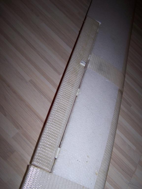 Uhlíkový nosník, vlepený do křídla od výroby jako výztuha, prochází těsně okolo přední hrany serva a tudíž zůstal (musel zůstat, počítalo se s tím při instalaci) neporušen, takže to vypadá, tuhost nijak neutrpěla - de-facto "torzní skříň" (pokud se dá tenhle termín na celoEPP křídlo aplikovat) zůstala komplet tak jak byla. Křídlo nemá ani při mechanickém testu ohybu tendenci se v místě uložení serva prohýbat více než jinde. Vzhledem k tomu, že v horní části dutiny, v níž je servo uloženo, je materiál (cca 1-2 mm, dle zakřivení profilu) vyztužen skelnou páskou a spodní část tvoří vteřiňákem nabodovaný plastový kryt překrývající celou dutinu, by měla tahle část být dokonce na ohyb odolnější :) Jestli je tahle teorie správná, ukáže čas, ale zatím se to chová naprosto v pohodě.