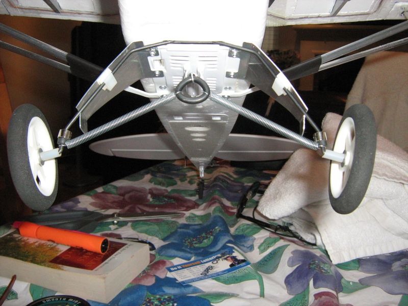 A čo tak medzi tie dráty urobiť tlmič, niečo ako má Piper, jeden tučný asi nie (tam sa ráta s tuhými nohami) ale dva dráty do kríža by mohli byť v pohode aj s mäkším drátom (dozadu to podvozok pustí, len roztiahnuť od seba nie?