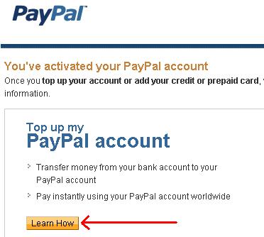 10. Po načtení nové stránky v ní budou informace o úspěšné aktivaci Paypal účtu viz obrázek obr7. Kliknetě na tlačítku Learn How jak ukazuje červená šipka na obrázku obr7.