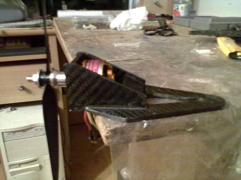 Zdravím pánové. Takže dnes mi taky praskl držák motoru. Přesně v místě kde jsou šrouby a kde už není přesah pro zapuštění do bočních dílů. Naštěstí jsem to vychytak na zemi, že je prasklý. Ve vzduchu by se nejspíše rozpadl úpně. Takže jsem vzal materiál který byl doma (asi 1,5mm překlížka) a udělal jsem výztuž napřímo nalepenou na ten původní. Hned je poznat, že je to poznání pevnější.