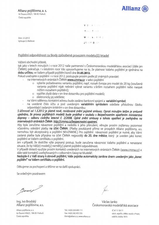 Zdravím všechny letce, přišel mi papír na prodloužení pojištění, a je v něm uvedeno, že od 1.3.2012 je platné nové znění pojistné smlouvy, kdy provoz pojištěných modelů bude probíhat v souladu s Bezpečnostním opatřením ministerstva dopravy - odboru civilního letectví č. 2/2008.