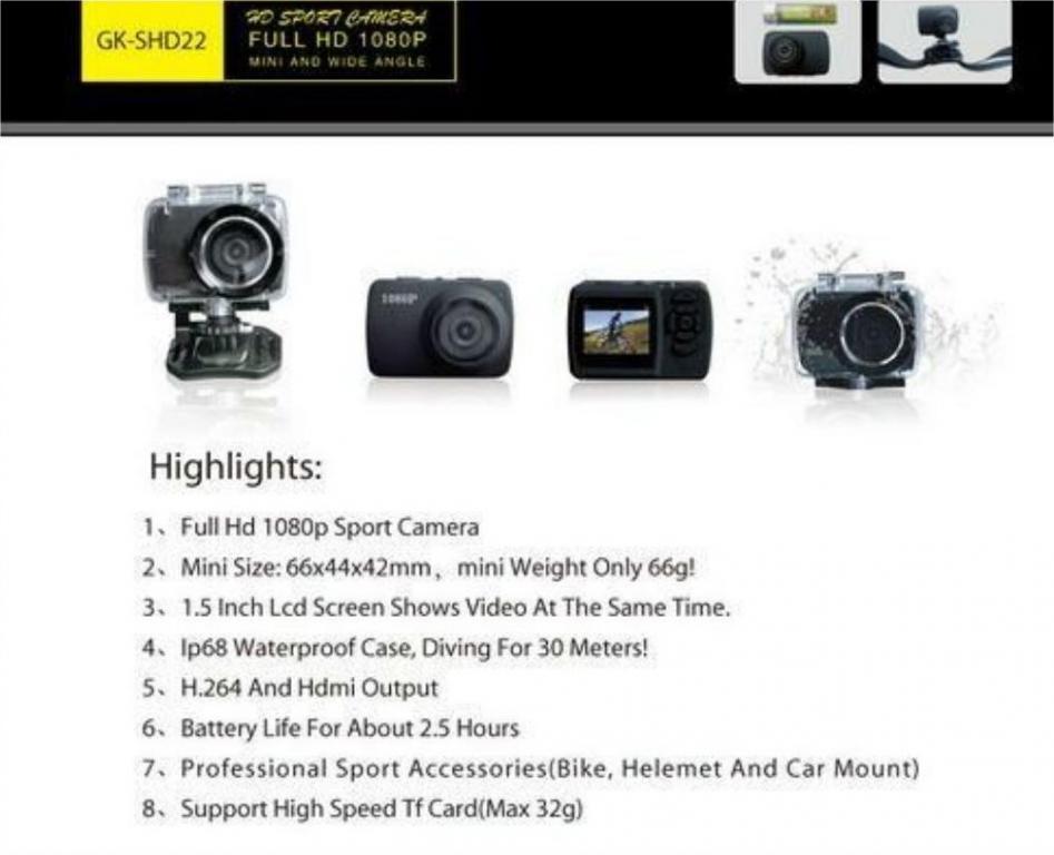 Na phled jako GoPRoHD, trošku menší, trošku lehčí, černé pogumované tělo. V příslušenství vodotěsné pouzdro (stejné jako u GoPro), různé držáky, nabíječka, kabely. Úhel jsem si mohl vybrat, testoval jsem GoPro se 170° a to bylo moc rybí, tak jsem si vybral 150° a je to akorát pro letadlo. Uvnitř to úplná kopie GoPro nebude, má to mikro SDHC kartu (originál je velkáSD), ukládá to s příponou MOV (originál MP4), takže soubory vycházejí menší než u origoše, vzadu je barevný displej!!! (origoš nemá žádný), ovládání je tlačítky jako na mobilu (menu, vlevo vpravo nahoru dolů OK) - origoš má jen 2 tlačítka. Vypínač je posuvný (beru jako plus, hned vidím jednoznačně že je zapnuto), jedním tlačítkem se fotí a jiným tlačítkem se spouští kamera. USB, HDMI, AV konektory.