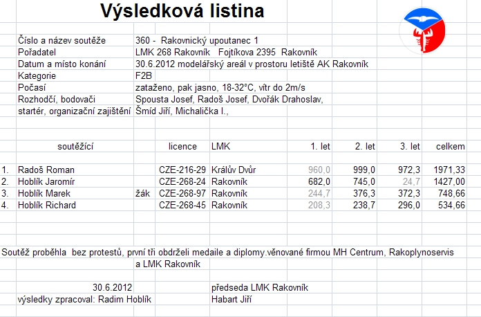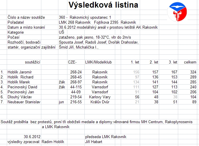 Nic jsme neuvařili i když ke konci bylo na padnutí. 8 lidí se se svými eroplány s horkem vyrovnalo dobře. F2B - 4 lidi (vyhrál Roman Radoš), UŠ - 7 lidí (neměl jsem přemožitele - Jakube příště přijeď). z 8mi modelů jen 3 čuďáky, F2B plně elektrifikované.