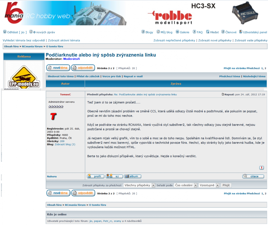 Když se podíváte na stránku RCMANIA, která využívá styl subsilver2, tak všechny odkazy jsou stejně barevné, nejsou podtržené a prostě se chovají stejně.