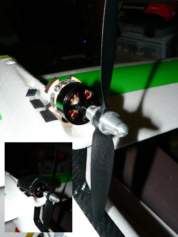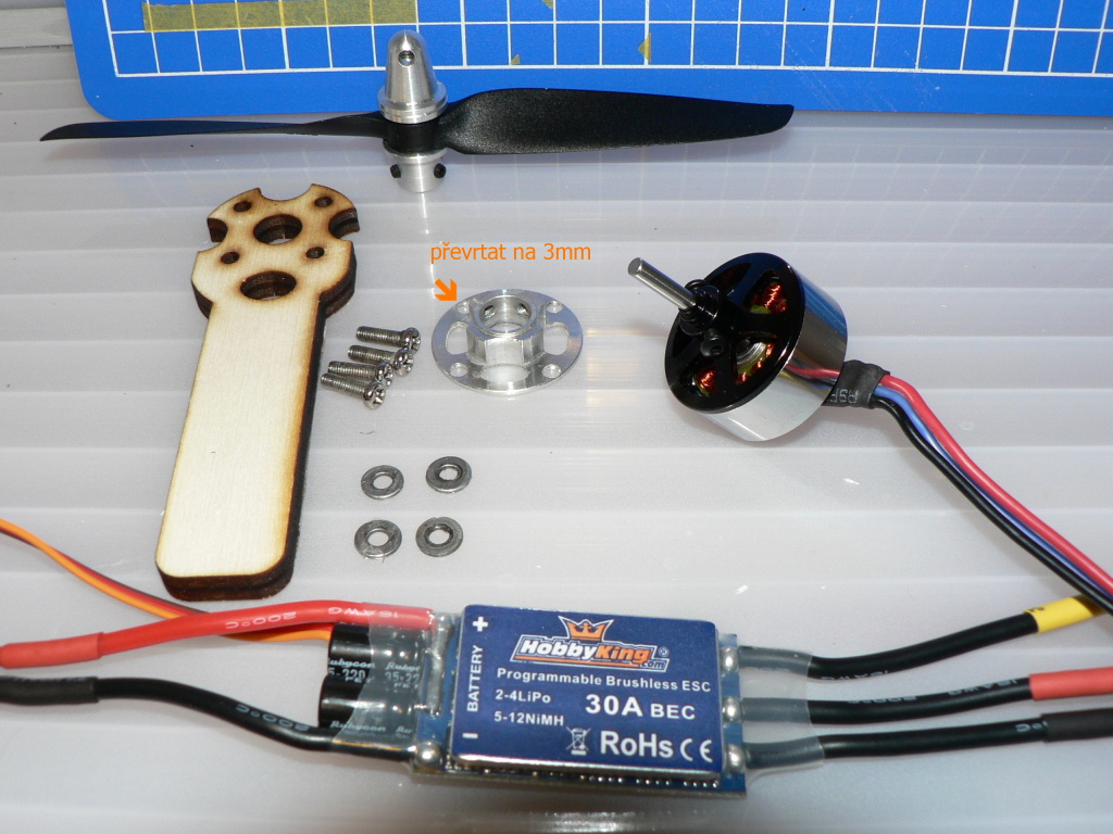 Tak, konečně jsem se dostal k instalaci nového motoru, protože původní měl po bouračce ohnutou hřídel a i po srovnání už to nebylo ono. Objednal jsem tedy Floater jet replacement motor, jak tady někdo radil a 30A blueseries reg - možná by stačil i menší, ale tohle se bude hodit do jiného letadla a není o tolik dražší. Je dobré kupovat jeden druh, stačí pak jedna programovací karta. Původní reg. jsem dal pryč, protože bych musel krátit dráty od motoru, a pokud by reg. shořel, musel bych ty dráty zase nastavovat, kdyby ho někdo chtěl je k dispozici za stovku, stejně tak ten motor, třeba na díly, oboje má nalítáno pár hodin pod plynem. Motor má otvory s roztečí 23,2 mm a jsou tak na M2. Řešil jsem, jestli dát menší šrouby, ale nakonec jsem převrtal na 3mm a je OK. Původní lože nešlo použít kvůli jiné rozteči, dal jsem taky 6x4 vrtuli, tak jsem to trochu zvednul, abych nemusel řezat do ocasu. Neudělal jsem delší spodní část, ale natáhnul jsem to nahoře, takže se spodní oblouk může opřít o trup, případně přilepit. Po výřezu všechno sedí přesně. Příruba motoru jde sundat, takže se nejdřív samostatně přišroubuje k loži původními šrouby ze setu a novými matičkami a následně na dva červíky připevní zbytek motoru. Dráty od motoru jsem protáhnul dopředu pomocí starého 1mm táhla v trubičce, jeden po druhém to jde snadno. Tohle řešení je o dost lepší než protahovat zepředu dozadu dlouhé dráty regulátoru. Po drobné úpravě půjde zpátky nalepit i kryt motoru, pravděpodobně z nějakého plastu vyříznu nějaký mezikusy.