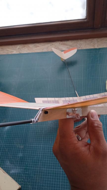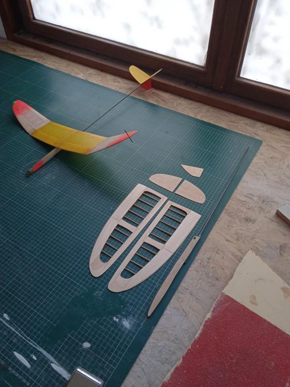 Jeste dodam ze ocasni plochy jsou potazeny slabym modelspanem nebo japanem a lakovany zaponem, Modelspan i japan mam jeste z dob Svazarmu ale bohuzel uz dochazi. A cele kridlo je potazeno Vliesem a taky lakovano smes lepici a napinaci lak takovej misunk, cca petkrat a barevne je to nastrikle signalnimy barvami ve spreji ale chce to jen tak pofoukat a jsou dost site ty barvy tak kvuli vaze.