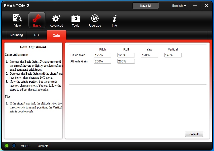 Ty zmíněné zisky jsou určitě v mezích používaných u těžších P2, akorát ty poslední 2 hodnoty pro Atti Gains už mohou být dost nízké, ně že by byl nějak nebezpečné, ale očekávej delší resp. pomalejší reakce, bude to asi takové línější na pitch a roll... Jello Ti zmizelo ? Jak jsi je zkoušel, namapováním na volný kanál, nebo zkusmo ?