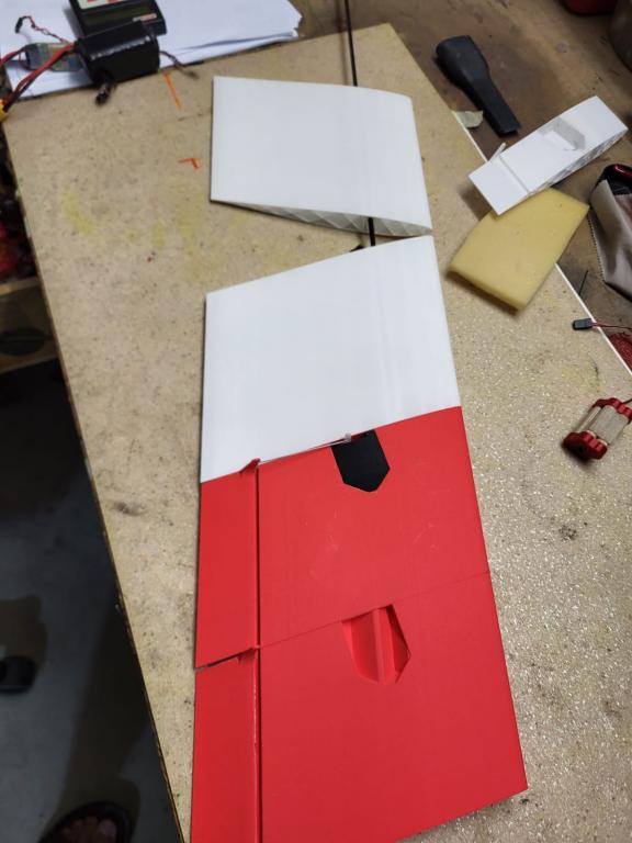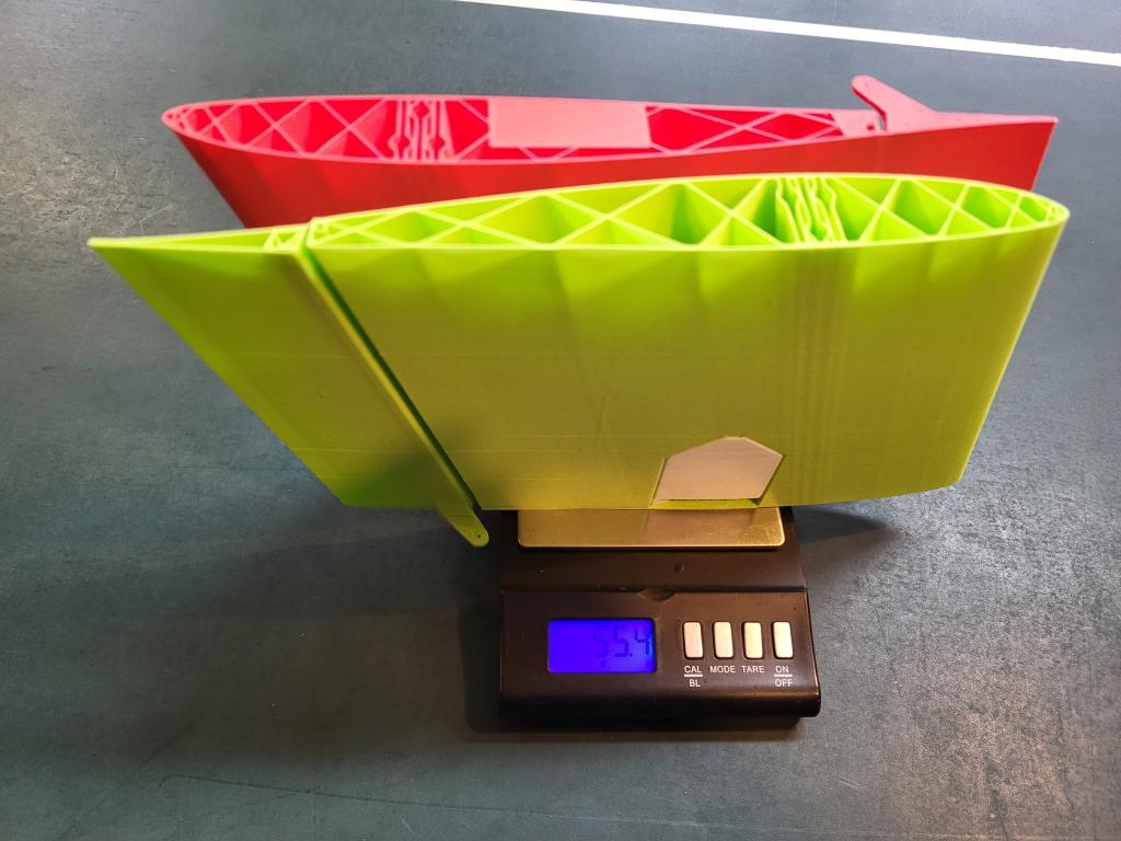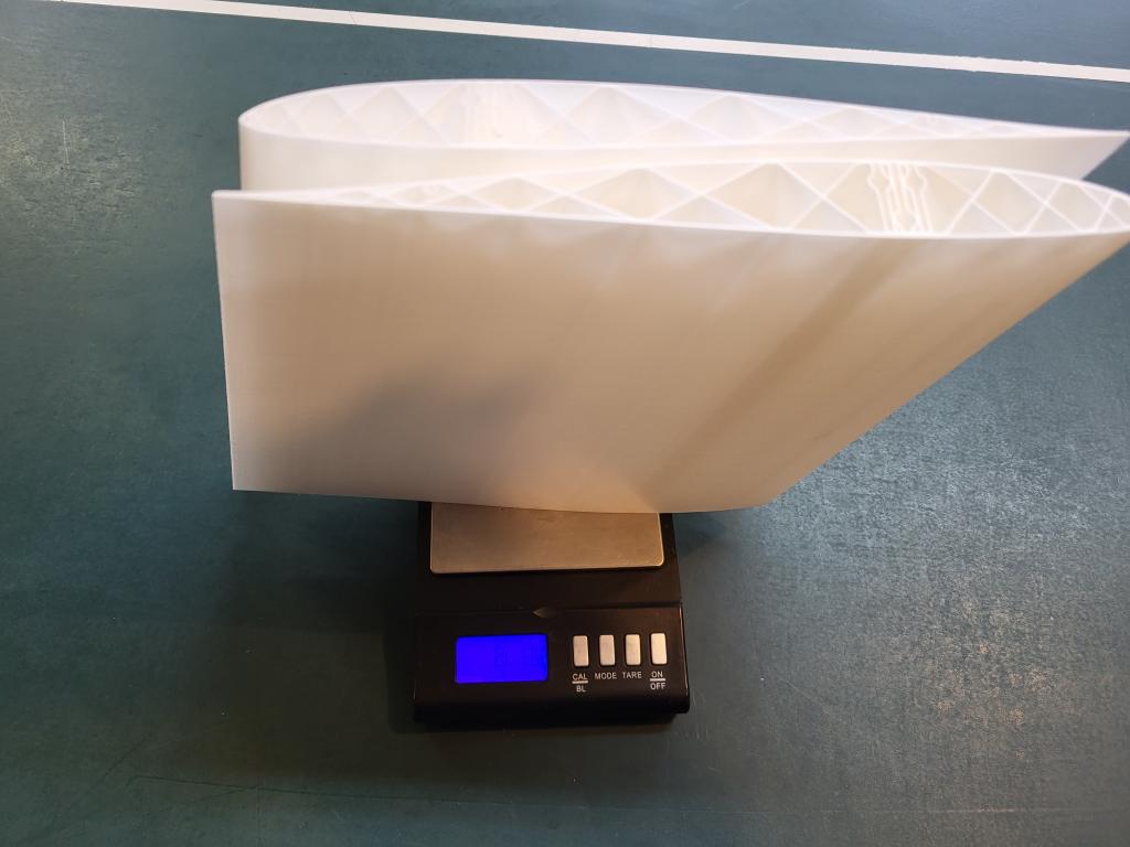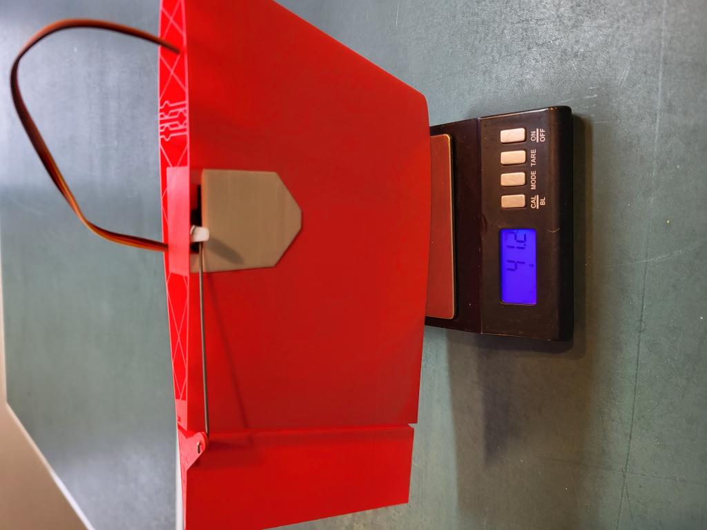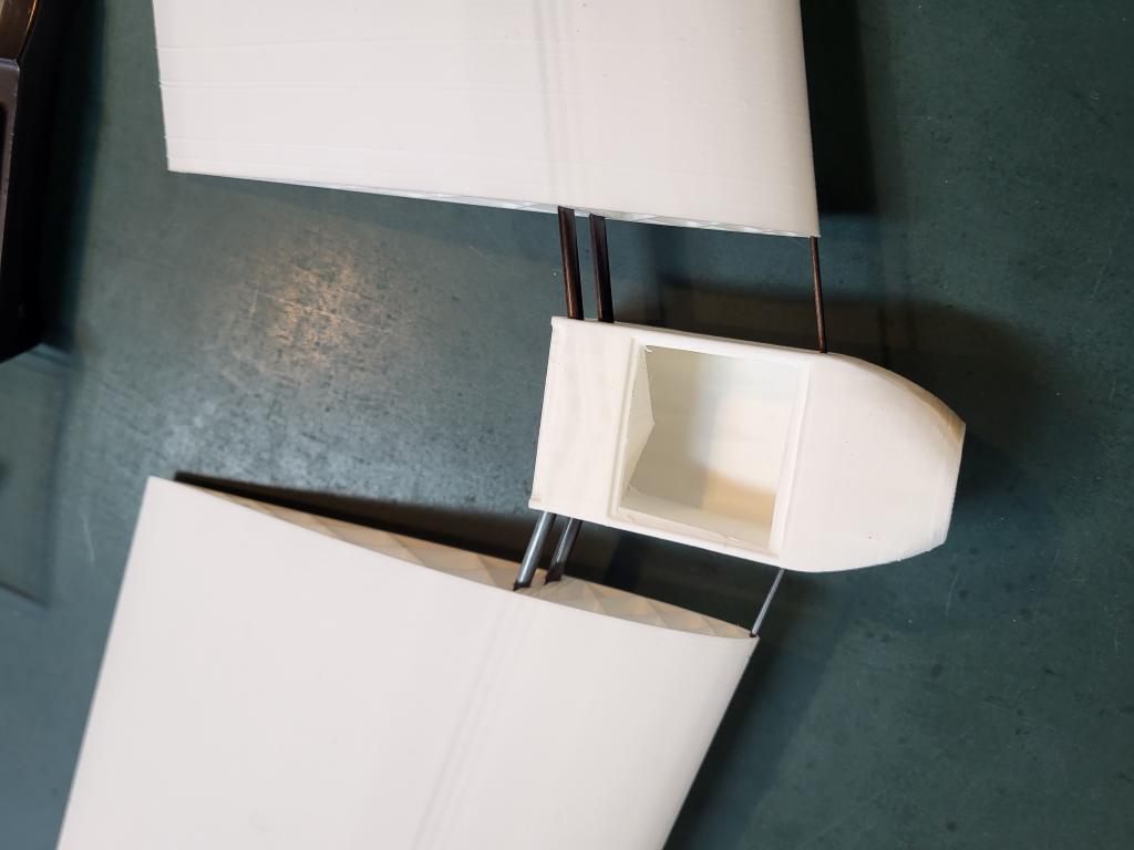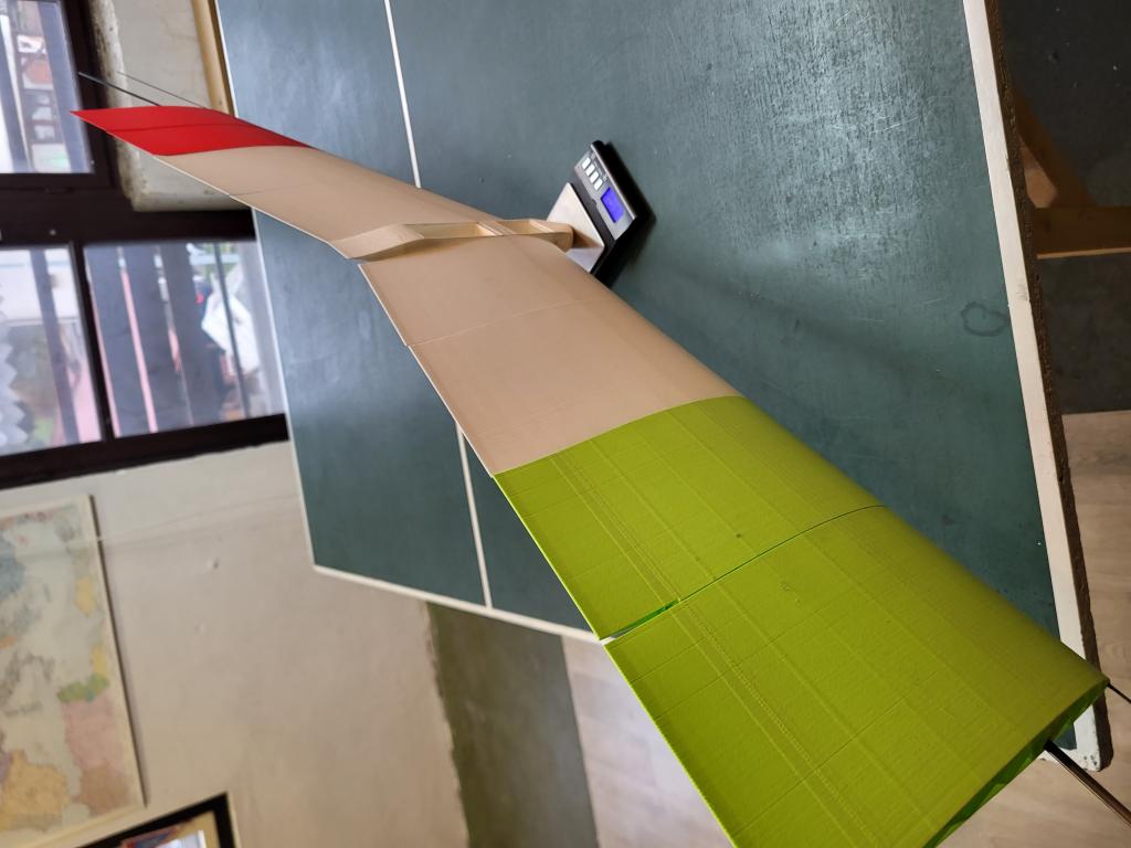 Trup je jen studijní, pro ověření pevnosti a tvaru křídla. 320mm šípového křídla hlubokého 200mm váží 67g. Se servem 120mm křídla váží 41g. Celé křídlo s uhlíkovými trubkami o rozpětí 120cm váží 310g.