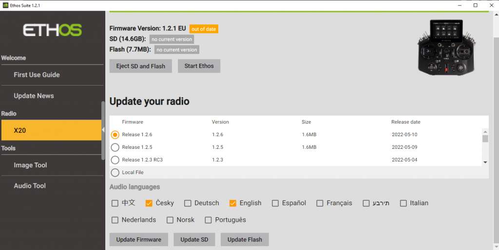 Musia byť aktualizované na verziu FW-Archer-2.1.10 a Ethos min. v1.2.0.