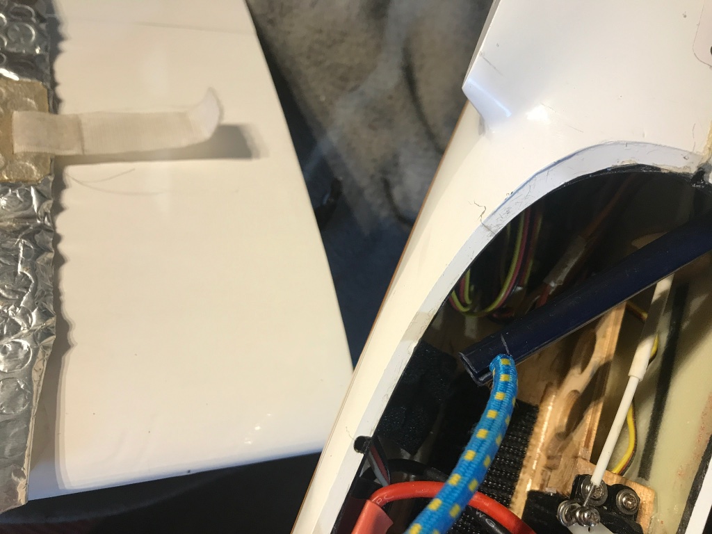 včera mi už definitivně naprdlo u Nimbuse donekonečna přelepovat křídla k trupu lepenkou a následně čas od času to opatlání lepidlem čistit, nebo se modlit, abych stržením té lepenky neserval i folii z křídla, nemám to zatím v praxi odzkoušené, ale si myslím, že neni duvod, aby to nefungovalo----do křídla vlepený opletený gumicuk co trupem projde už dostatečným otvorem a zevnitř trupu je guma zastrčená do plastové trubičky s výřezem který gumu přiměřeně napnutou zajistí. Jestli se to osvědčí, asi to takto předělám i na ostatních modelech kde to jistím na tvrdo bud plastovými šrouby, nebo v křídlech očka a v trupu staženo taky gumicukem s olivou, s čímž je teda děsně blbá manipulace a hlavně do trupu nutný větší výřez kterým musí projít to očko.