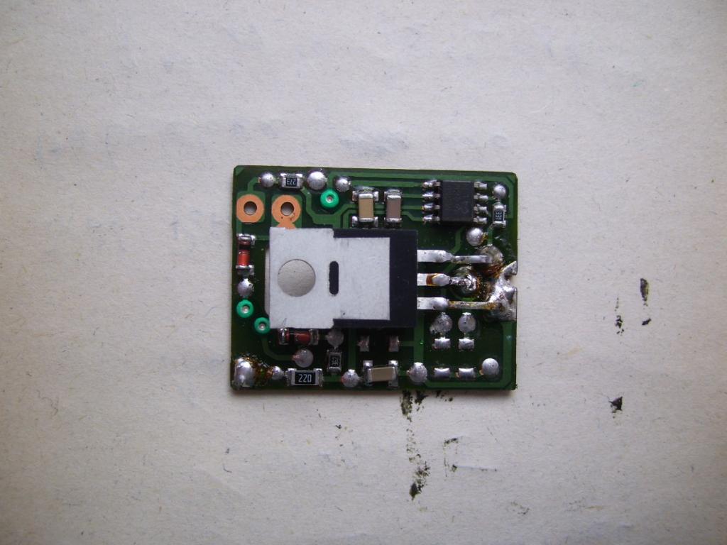 Napájel sem tam tedy ten doporučovanej IRL2203N:Jelikož mam na pájení akorát pistolovku, tak sem si netroufnul jít s letováním až na desku a raději uštíp původní tranzistor a novej naletoval na původní pacičky. V tom by problém hádam být neměl. Bohužel regl s novým tranzistorem nejede. Ostatní součástky na oko i na nos vypadají nepoškozeně.