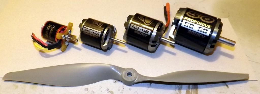 Zleva P-38 (1310mm), DH98 (1600mm), B25 (2050mm) a F7F (2080mm); vrtule (pro měřítko) má 12".
