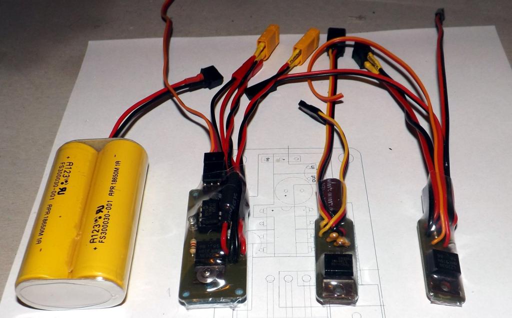 Dneska jsem moc netvořil, jen pár plošňáků dopoledne a po O jsem je osadil. Zleva - aku 2s LiFe 1100mAh, elektronický RC spínač napájení pro zvukový modul, stabilizátor napětí (a omezovač proudu) s L7805 pro elektroniku podvozku (nemá to rádo ani 6V, pak to hoří bez uzardění) a elektronický spínač přijímačových aku pro trup.