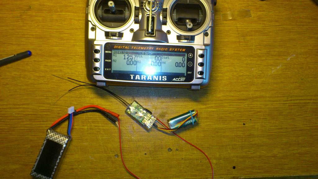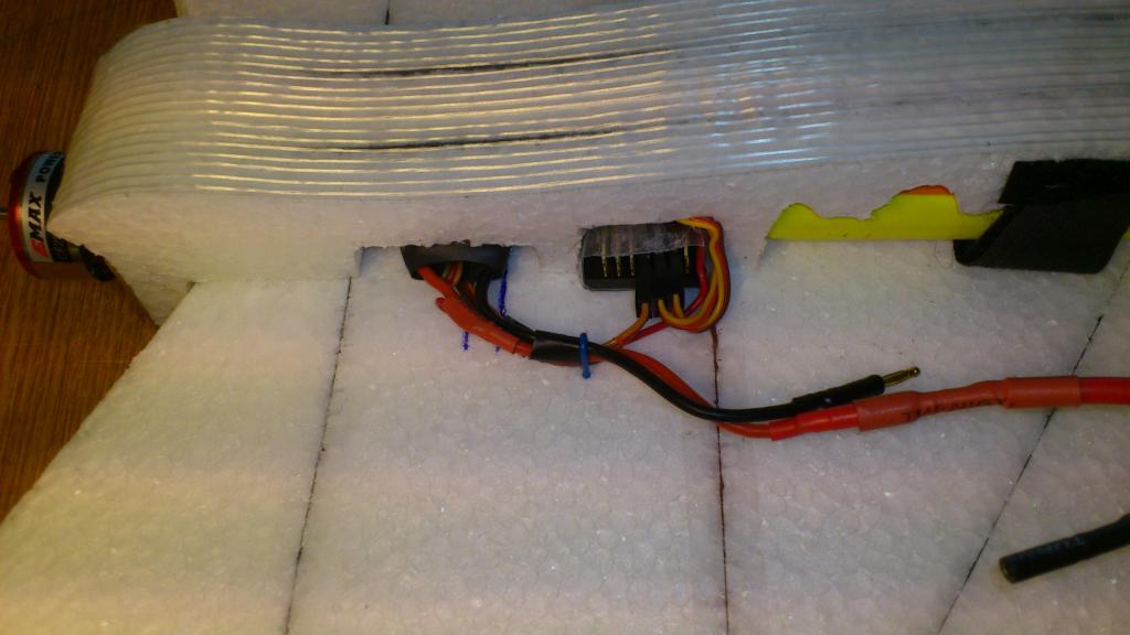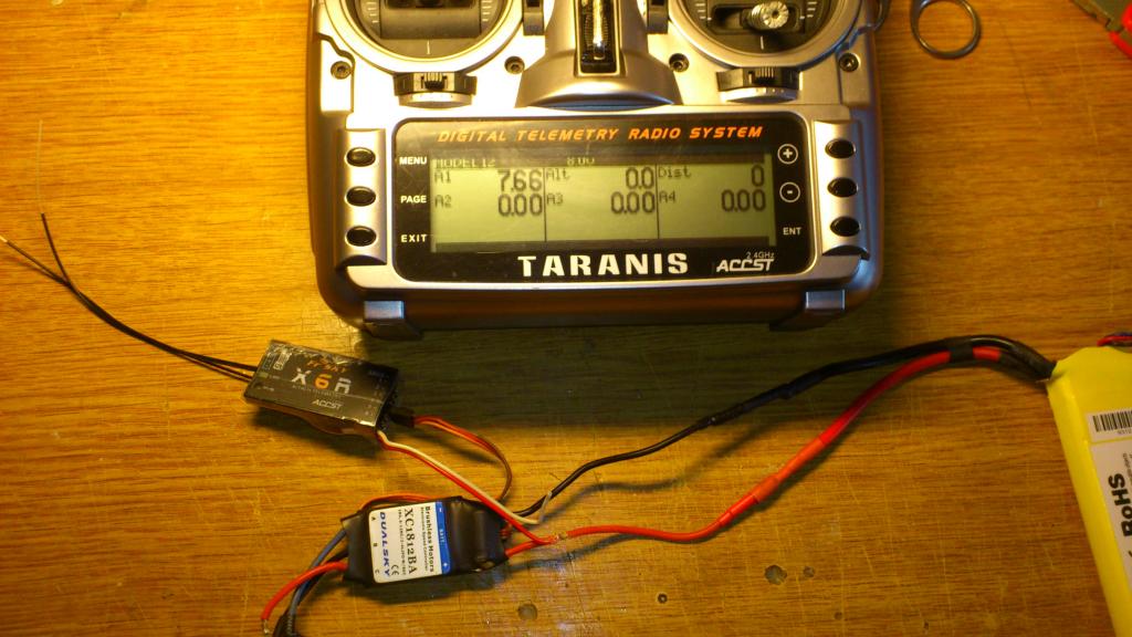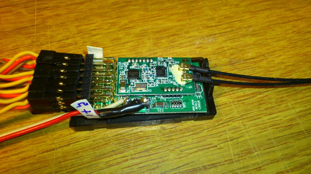 Rozhodol som sa postaviť si nové Toro. To staré - Minitornádo 280 - má viac, ako 20 rokov.... Premýšľal som, aký príjmač použiť.... V starom som mal D4 - vario funguje, A1/A2 tiež, ale pokiaľ by som chcel pripojiť GPS - smolík.... Druhou možnosťou je X6R - ten je ale dosť ťažký a zbytočne veľký. Je ale možné ho prebaliť do fólie.... Keď už som sa s tým hral, rozhodol som sa vyviesť aj signál A1 a dovnútra umiestniť odporový delič pre meranie pohonného aku. Nemal som vhodnú priehľadnú hadicu - Našiel som len veľkú.... Rozrezal som ju, zúžil a znovu zlepil..... Medzi A1 a G som zapojil odpor 6K8 a k A1 je v bužírke 20K. Cez tento odpor je pripojené merané napetie z aku. Káblik od G - teda - pól - biely, nieje potrebné zapájať. Merá to ako tak. Vhodnejšie hodnoty odporov pre delič som doma nenašiel... Vhodnejšie by boli 3K3/10K.....