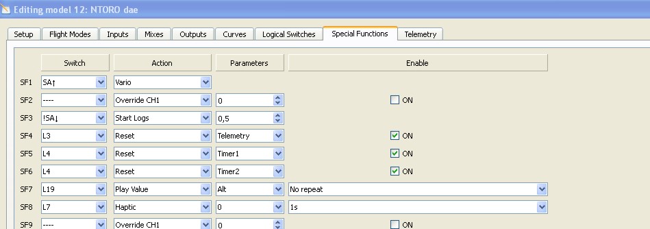 Je to dobré hlavne pre elektro vetrone. Často sa my stávalo, že som pred štartom zabudol RESET, či už stopiek alebo telemetrie a potom hodnoty nezodpovedali reálu. Tak som to vyriešil priradením ho k prepínaču blokovania motora (u mňa SF) nakoľko ho zapínam tesne pred hodom modelu. (Na obrázku chýba funkcia blokovanie motora, ale to už každý asi pozná)