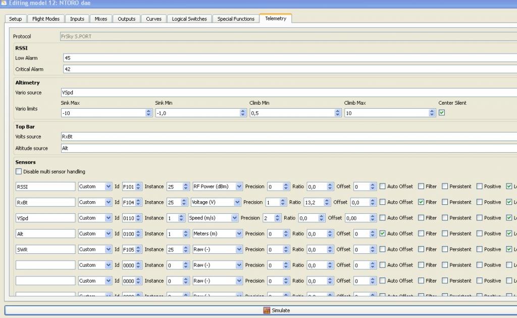 2 Bayt ID-Code // FrSky nové dáta ID (2 byty) RSSI_ID F101 ADC1_ID F102 ADC2_ID F103 BATT_ID F104 SWR_ID F105 T1_FIRST_ID 0400 T1_LAST_ID 040F T2_FIRST_ID 0410 T2_LAST_ID 041F RPM_FIRST_ID 0500 RPM_LAST_ID 050F FUEL_FIRST_ID 0600 FUEL_LAST_ID 060F ALT_FIRST_ID 0100 ALT_LAST_ID 010F VARIO_FIRST_ID 0110 VARIO_LAST_ID 011F ACCX_FIRST_ID 0700 ACCX_LAST_ID 070F ACCY_FIRST_ID 0710 ACCY_LAST_ID 071F ACCZ_FIRST_ID 0720 ACCZ_LAST_ID 072F CURR_FIRST_ID 0200 CURR_LAST_ID 020F VFAS_FIRST_ID 0210 VFAS_LAST_ID 021F CELLS_FIRST_ID 0300 CELLS_LAST_ID 030F GPS_LONG_LATI_FIRST_ID 0800 GPS_LONG_LATI_LAST_ID 080F GPS_ALT_FIRST_ID 0820 GPS_ALT_LAST_ID 082F GPS_SPEED_FIRST_ID 0830 GPS_SPEED_LAST_ID 083F GPS_COURS_FIRST_ID 0840 GPS_COURS_LAST_ID 084F GPS_TIME_DATE_FIRST_ID 0850 GPS_TIME_DATE_LAST_ID 085F // FrSky chybné ID? BETA_VARIO_ID 8030 BETA_BARO_ALT_ID 8010 Zriadenie Príklad z V2.099 ID mená ID ----- ------- ?? ---- RSSI F101 25 SWR F105 25 Temp1 0400 5 temp2 0410 5 Alt 0100 1 Celso 0300 2 Curr 0200 3 RPM 0500 5 Palivo 0A10 11 Niektorí sa pýtajú, kde je doku pre Sub-ID RSSI má číslo F101 v poriadku, ale prečo 25 Curr má číslo 0200 v poriadku, ale prečo 3 Fuel má ID 0A10 v poriadku, ale prečo 11 ---- -------------------------------------------------- - Ako naprogramovať non FrSky-Sensor s identifikačným a Sub-ID SM Unisens-E vysiela 7 hodnoty a má normálnu ID 0x53 napätie prúdu Power Spotreba RPM Alt Vario